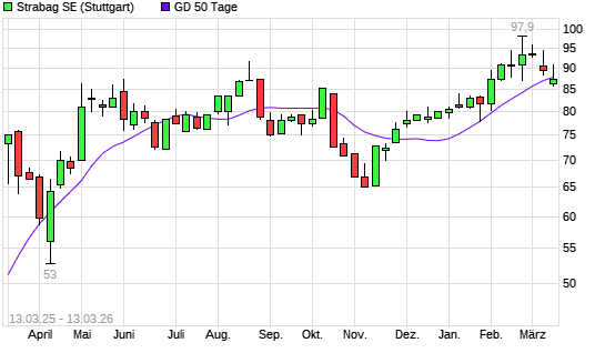 Mit dem Rücksetzer auf 87,40 EUR hat die Strabag SE-Aktie am 12.03.2026 die 50-Tage-Linie nach unten gekreuzt.Die Strabag SE-Aktie befindet sich seit dem 24.11.2025 im ...weiterlesen