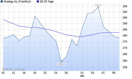 Mit dem Rücksetzer auf 279,10 EUR hat die Strategy-Aktie am 09.10.2025 die 20-Tage-Linie nach unten gekreuzt.Die Strategy-Aktie befindet sich seit dem 14.08.2025 im langfristigen Abwärtstrend ...weiterlesen