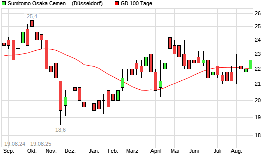 Mit dem Anstieg auf 22,40 EUR hat die Sumitomo Osaka Cement-Aktie am 18.08.2025 die 100-Tage-Linie nach oben gekreuzt.Die Sumitomo Osaka Cement-Aktie befindet sich seit dem 29.07.2025 im langfristigen ...weiterlesen