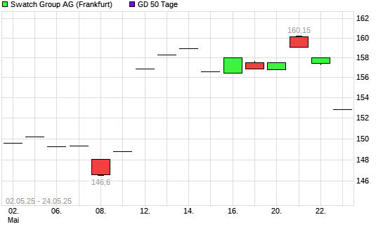 Mit dem Rücksetzer auf 152,80 EUR hat die Swatch Group Inhaber-Aktien-Aktie am 23.05.2025 die 50-Tage-Linie nach unten gekreuzt.Die Swatch Group Inhaber-Aktien-Aktie befindet sich seit ...weiterlesen