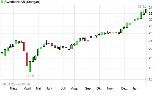 Mit dem Anstieg auf 33,57 EUR hat die Swedbank AB-Aktie (ISIN SE0000242455) am 27.01.2026 ein neues All-Time-High erreicht und damit den Kurs vom 22.01.2026 eingestellt.Die Swedbank AB-Aktie ...weiterlesen