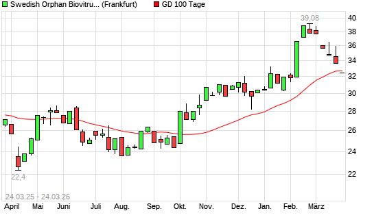 Mit dem Rücksetzer auf 32,42 EUR hat die Swedish Orphan Biovi-Aktie am 23.03.2026 die 100-Tage-Linie nach unten gekreuzt.Die Swedish Orphan Biovi-Aktie befindet sich seit ...weiterlesen