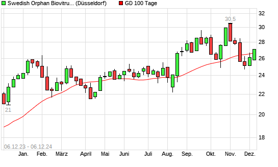 Mit dem Anstieg auf 26,86 EUR hat die Swedish Orphan Biovi-Aktie am 05.12.2024 die 100-Tage-Linie nach oben gekreuzt.Die Swedish Orphan Biovi-Aktie befindet sich seit dem 22.11.2024 im langfristigen ...weiterlesen