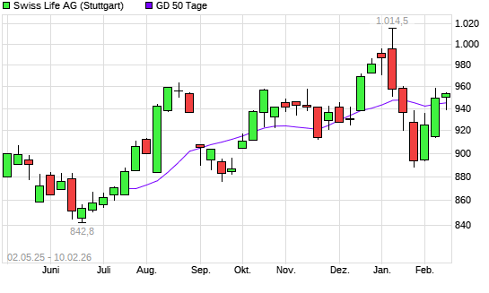 Mit dem Anstieg auf 957,40 EUR hat die Swiss Life-Aktie am 09.02.2026 die 50-Tage-Linie nach oben gekreuzt.Die Swiss Life-Aktie befindet sich seit dem 29.01.2026 im langfristigen Aufwärtstrend ...weiterlesen