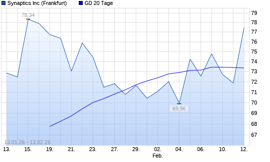 Mit dem Anstieg auf 77,46 EUR hat die Synaptics-Aktie am 12.02.2026 die 20-Tage-Linie nach oben gekreuzt.Die Synaptics-Aktie befindet sich seit dem 24.11.2025 im langfristigen Aufwärtstrend ...weiterlesen