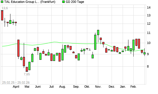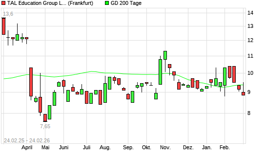 Mit dem Rücksetzer auf 8,85 EUR hat die TAL Education-Aktie am 24.02.2026 die 200-Tage-Linie nach unten gekreuzt.Die TAL Education-Aktie befand sich seit dem 23.02.2026 ...weiterlesen