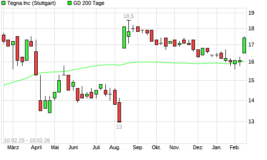Mit dem Anstieg auf 17,00 EUR hat die TEGNA-Aktie am 09.02.2026 die 200-Tage-Linie nach oben gekreuzt.Die TEGNA-Aktie befand sich seit dem 04.02.2026 im langfristigen Abwärtstrend und hat in ...weiterlesen