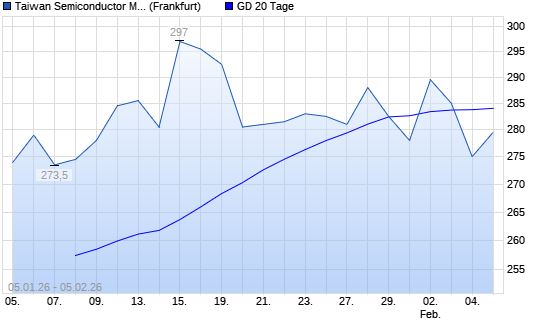 Mit dem Rücksetzer auf 275,00 EUR hat die TSMC-Aktie am 04.02.2026 die 20-Tage-Linie nach unten gekreuzt.Die TSMC-Aktie befindet sich seit dem 03.06.2025 im langfristigen Aufwärtstrend ...weiterlesen