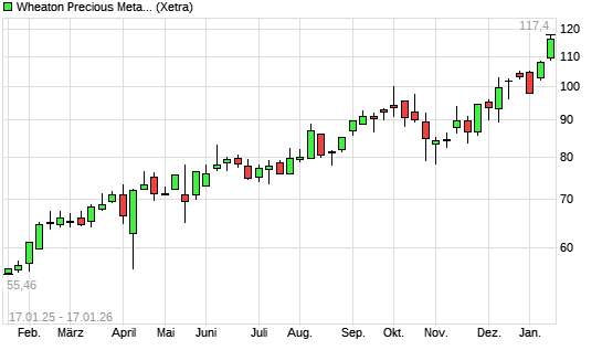 Mit dem Anstieg auf 116,15 EUR hat die Wheaton Precious Metals-Aktie (ISIN CA9628791027) am 16.01.2026 ein neues All-Time-High erreicht und damit den Kurs vom 15.01.2026 eingestellt.Die Wheaton ...weiterlesen