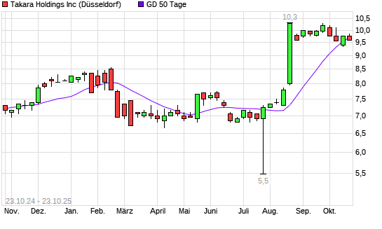 Mit dem Rücksetzer auf 9,70 EUR hat die Takara Holdings-Aktie am 22.10.2025 die 50-Tage-Linie nach unten gekreuzt.Die Takara Holdings-Aktie befindet sich seit dem 04.08.2025 im langfristigen ...weiterlesen