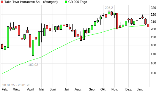 Mit dem Rücksetzer auf 204,55 EUR hat die Take 2 Interactive-Aktie am 19.01.2026 die 200-Tage-Linie nach unten gekreuzt.Die Take 2 Interactive-Aktie befand sich seit dem 19.11.2025 im langfristigen ...weiterlesen