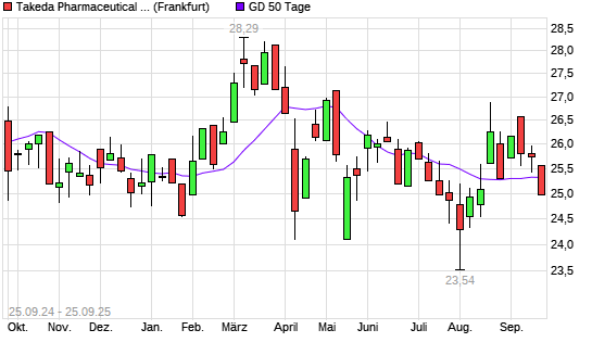 Mit dem Rücksetzer auf 25,20 EUR hat die Takeda Pharmaceutical-Aktie am 24.09.2025 die 50-Tage-Linie nach unten gekreuzt.Die Takeda Pharmaceutical-Aktie befindet sich seit dem 16.09.2025 ...weiterlesen