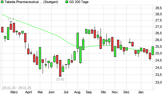 Mit dem Anstieg auf 25,38 EUR hat die Takeda Pharmaceutical-Aktie am 28.01.2025 die 200-Tage-Linie nach oben gekreuzt.Die Takeda Pharmaceutical-Aktie befand sich seit dem 16.01.2025 im langfristigen ...weiterlesen
