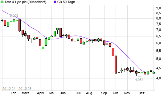 Mit dem Anstieg auf 4,34 EUR hat die Tate & Lyle-Aktie am 29.12.2025 die 50-Tage-Linie nach oben gekreuzt.Die Tate & Lyle-Aktie befindet sich seit dem 27.12.2024 im langfristigen Abwärtstrend ...weiterlesen