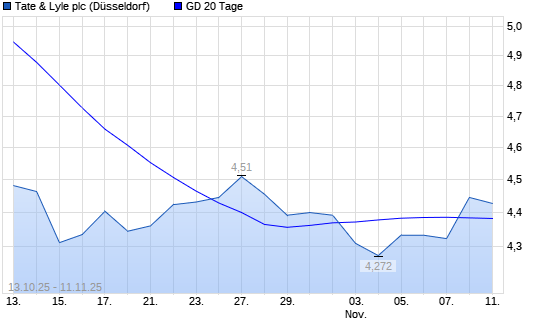 Mit dem Anstieg auf 4,41 EUR hat die Tate & Lyle-Aktie am 10.11.2025 die 20-Tage-Linie nach oben gekreuzt.Die Tate & Lyle-Aktie befindet sich seit dem 27.12.2024 im langfristigen Abwärtstrend ...weiterlesen