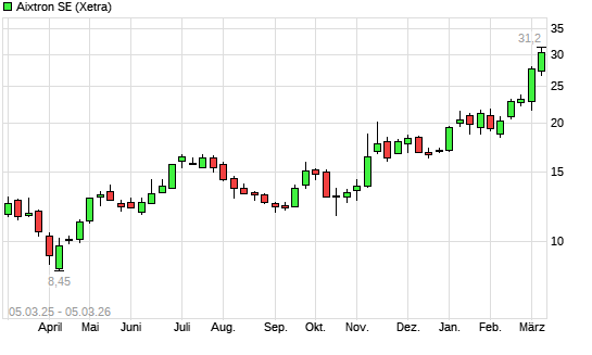 Mit dem Anstieg auf 30,38 EUR hat die Aixtron-Aktie (ISIN DE000A0WMPJ6) am 04.03.2026 ein neues 12-Monats-Hoch erreicht und damit den Kurs vom 02.03.2026 eingestellt.Die ...weiterlesen