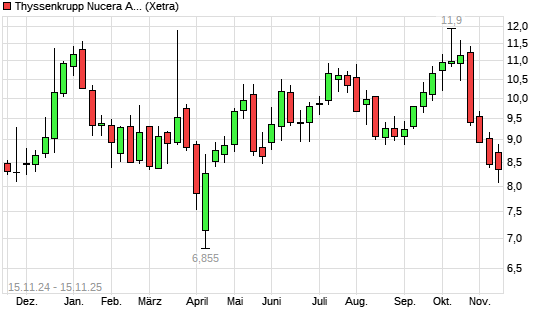 Mit dem Rücksetzer auf 8,32 EUR hat die thyssenkrupp nucera AG-Aktie (ISIN DE000NCA0001) am 14.11.2025 ein neues 6-Monats-Tief erreicht und damit den Kurs vom 13.11.2025 eingestellt.Die ...weiterlesen