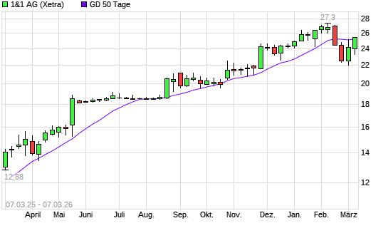 Mit dem Anstieg auf 25,50 EUR hat die 1&1 Drillisch-Aktie am 06.03.2026 die 50-Tage-Linie nach oben gekreuzt.Die 1&1 Drillisch-Aktie befindet sich seit dem 05.03.2025 im ...weiterlesen