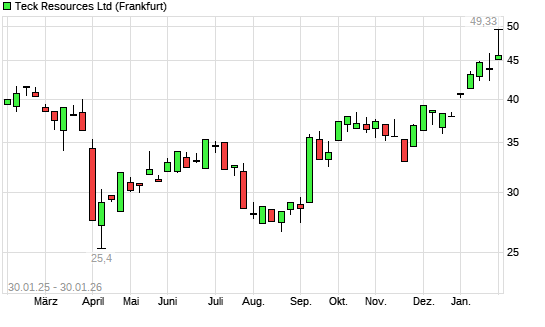 Mit dem Anstieg auf 49,33 EUR hat die Teck Resources-Aktie (ISIN CA8787422044) am 29.01.2026 ein neues 12-Monats-Hoch erreicht und damit den Kurs vom 28.01.2026 eingestellt.Die Teck Resources-Aktie ...weiterlesen