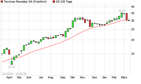 Mit dem Rücksetzer auf 29,78 EUR hat die Tecnicas Reunidas-Aktie am 12.03.2026 die 100-Tage-Linie nach unten gekreuzt.Die Tecnicas Reunidas-Aktie befindet sich seit dem 10.04.2025 ...weiterlesen