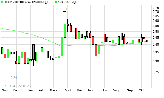 Mit dem Anstieg auf 0,43 EUR hat die Tele Columbus-Aktie am 21.10.2025 die 200-Tage-Linie nach oben gekreuzt.Die Tele Columbus-Aktie befand sich seit dem 16.10.2025 im langfristigen Abwärtstrend ...weiterlesen