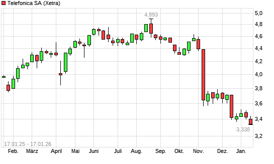Mit dem Rücksetzer auf 3,33 EUR hat die Telefónica-Aktie (ISIN ES0178430E18) am 16.01.2026 ein neues 3-Jahres-Tief erreicht und damit den Kurs vom 13.01.2026 eingestellt.Die Telefónica-Aktie ...weiterlesen