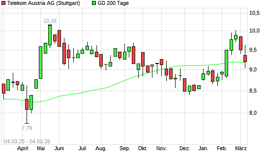 Mit dem Rücksetzer auf 9,09 EUR hat die Telekom Austria-Aktie am 03.03.2026 die 200-Tage-Linie nach unten gekreuzt.Die Telekom Austria-Aktie befand sich seit dem 04.02.2026 ...weiterlesen