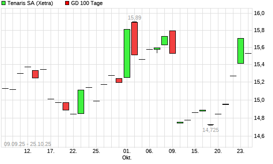 Mit dem Anstieg auf 15,69 EUR hat die Tenaris-Aktie am 24.10.2025 die 100-Tage-Linie nach oben gekreuzt.Die Tenaris-Aktie befindet sich seit dem 04.04.2025 im langfristigen Abwärtstrend und ...weiterlesen