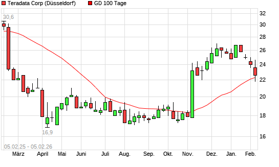 Mit dem Anstieg auf 23,00 EUR hat die Teradata-Aktie am 09.02.2026 die 100-Tage-Linie nach oben gekreuzt.Die Teradata-Aktie befindet sich seit dem 05.11.2025 im langfristigen Aufwärtstrend und ...weiterlesen