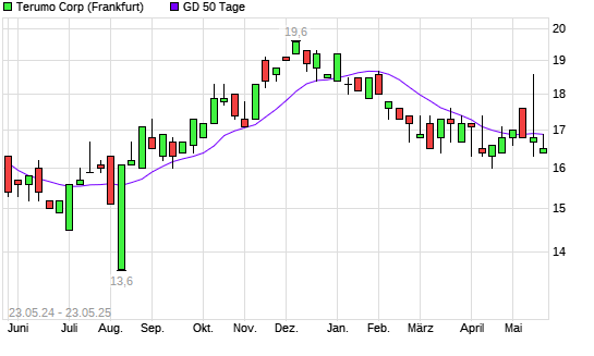 Mit dem Anstieg auf 16,90 EUR hat die Terumo-Aktie am 22.05.2025 die 50-Tage-Linie nach oben gekreuzt.Die Terumo-Aktie befindet sich seit dem 15.05.2025 im langfristigen Abwärtstrend und hat ...weiterlesen