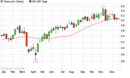 Mit dem Anstieg auf 5,10 EUR hat die Tesco-Aktie am 23.12.2025 die 100-Tage-Linie nach oben gekreuzt.Die Tesco-Aktie befindet sich seit dem 16.05.2025 im langfristigen Aufwärtstrend und hat ...weiterlesen