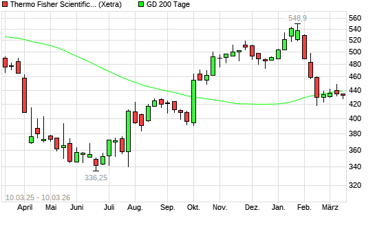 Mit dem Rücksetzer auf 430,40 EUR hat die Thermo Fisher-Aktie am 09.03.2026 die 200-Tage-Linie nach unten gekreuzt.Die Thermo Fisher-Aktie befand sich seit dem 05.03.2026 ...weiterlesen
