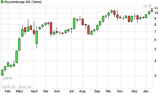 Mit dem Anstieg auf 10,76 EUR hat die ThyssenKrupp-Aktie (ISIN DE0007500001) am 12.01.2026 ein neues 5-Jahres-Hoch erreicht und damit den Kurs vom 09.01.2026 eingestellt.Die ThyssenKrupp-Aktie ...weiterlesen