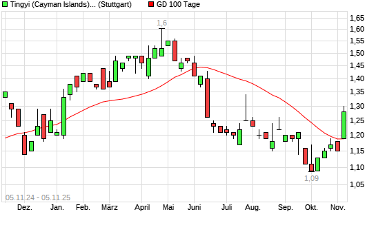 Mit dem Anstieg auf 1,23 EUR hat die Tingyi (Cayman Islands) Holding-Aktie am 04.11.2025 die 100-Tage-Linie nach oben gekreuzt.Die Tingyi (Cayman Islands) Holding-Aktie befindet sich seit dem ...weiterlesen
