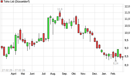 Mit dem Rücksetzer auf 7,95 EUR hat die Toho-Aktie (ISIN JP3598600009) am 26.02.2026 ein neues 12-Monats-Tief erreicht und damit den Kurs vom 04.02.2026 eingestellt.Die ...weiterlesen
