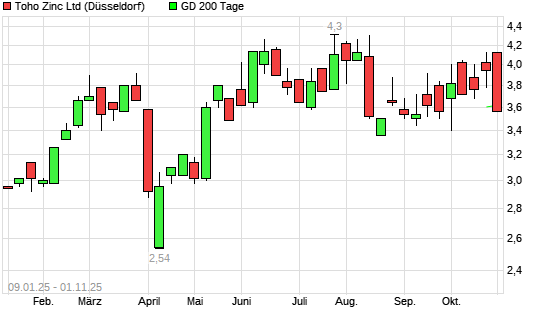 Mit dem Rücksetzer auf 3,56 EUR hat die Toho Zinc-Aktie am 31.10.2025 die 200-Tage-Linie nach unten gekreuzt.Die Toho Zinc-Aktie befand sich seit dem 02.10.2025 im langfristigen Aufwärtstrend ...weiterlesen