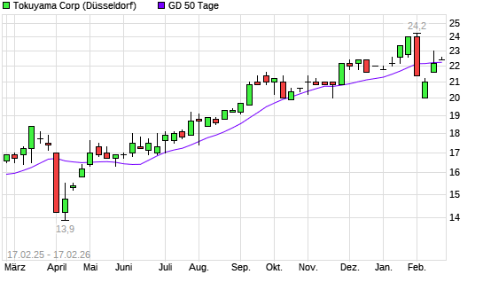 Mit dem Anstieg auf 22,60 EUR hat die Tokuyama-Aktie am 16.02.2026 die 50-Tage-Linie nach oben gekreuzt.Die Tokuyama-Aktie befindet sich seit dem 21.05.2025 im langfristigen ...weiterlesen