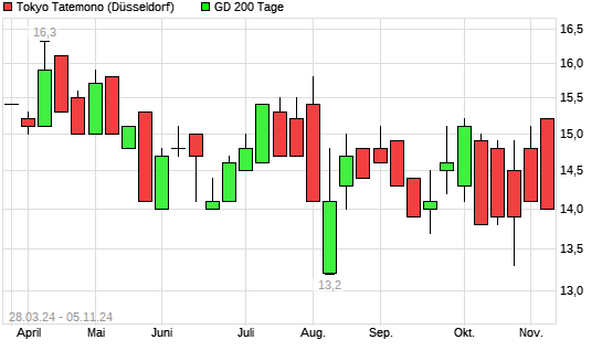 Mit dem Rücksetzer auf 14,20 EUR hat die Tokyo Tatemono-Aktie am 04.11.2024 die 200-Tage-Linie nach unten gekreuzt.Die Tokyo Tatemono-Aktie befand sich seit dem 01.11.2024 im langfristigen ...weiterlesen