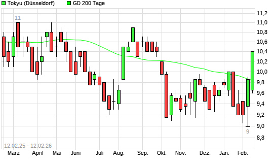 Mit dem Anstieg auf 9,95 EUR hat die Tokyu-Aktie am 11.02.2026 die 200-Tage-Linie nach oben gekreuzt.Die Tokyu-Aktie befand sich seit dem 30.09.2025 im langfristigen Aufwärtstrend und ...weiterlesen