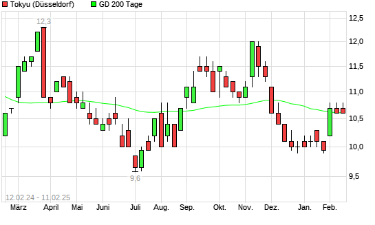 Mit dem Anstieg auf 10,70 EUR hat die Tokyu-Aktie am 10.02.2025 die 200-Tage-Linie nach oben gekreuzt.Die Tokyu-Aktie befand sich seit dem 05.02.2025 im langfristigen Abwärtstrend und hat in ...weiterlesen