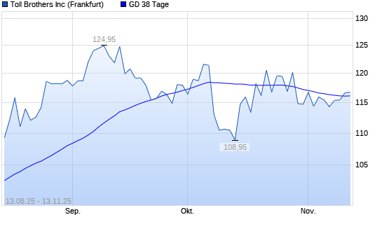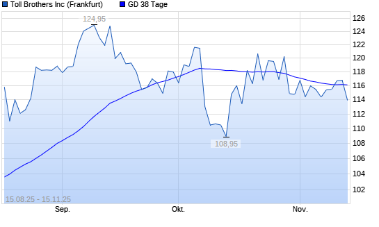 Mit dem Rücksetzer auf 113,90 EUR hat die Toll Brothers-Aktie am 14.11.2025 die 38-Tage-Linie nach unten gekreuzt.Die Toll Brothers-Aktie befindet sich seit dem 14.08.2025 im langfristigen ...weiterlesen