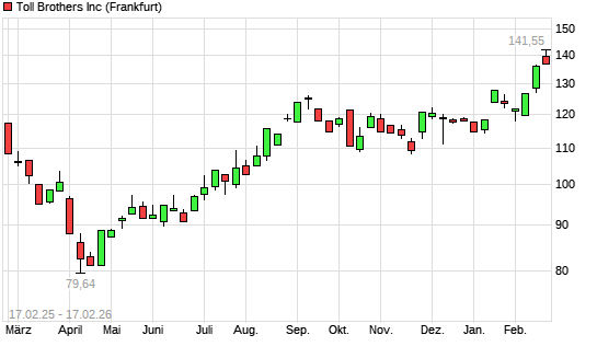 Mit dem Anstieg auf 139,60 EUR hat die Toll Brothers-Aktie (ISIN US8894781033) am 16.02.2026 ein neues 12-Monats-Hoch erreicht und damit den Kurs vom 12.02.2026 eingestellt.Die ...weiterlesen