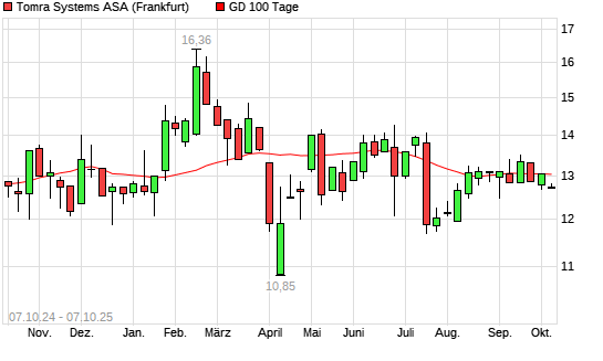 Mit dem Rücksetzer auf 12,76 EUR hat die Tomra Systems-Aktie am 06.10.2025 die 100-Tage-Linie nach unten gekreuzt.Die Tomra Systems-Aktie befindet sich seit dem 22.09.2025 im langfristigen ...weiterlesen