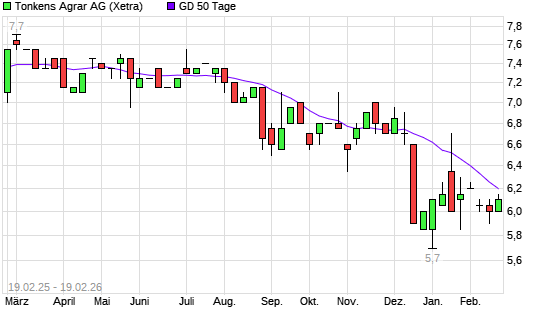 Mit dem Rücksetzer auf 5,95 EUR hat die Tonkens Agrar-Aktie am 18.02.2026 die 50-Tage-Linie nach unten gekreuzt.Die Tonkens Agrar-Aktie befindet sich seit dem 21.07.2025 ...weiterlesen