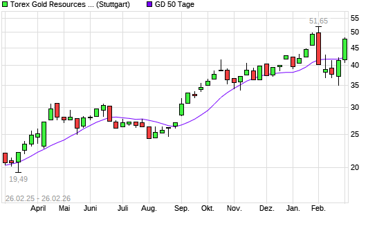 Mit dem Anstieg auf 47,32 EUR hat die Torex Gold Resources-Aktie am 25.02.2026 die 50-Tage-Linie nach oben gekreuzt.Der Abstand zur 200-Tage-Linie beträgt aktuell +36,76%. ...weiterlesen
