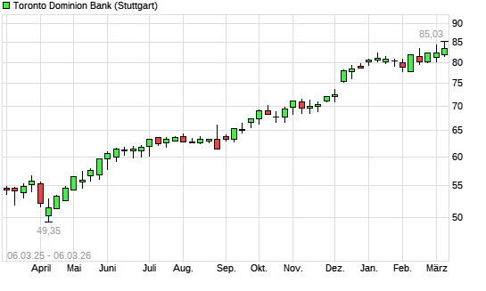 Mit dem Anstieg auf 84,67 EUR hat die Toronto-Dominion Bank-Aktie (ISIN CA8911605092) am 05.03.2026 ein neues All-Time-High erreicht und damit den Kurs vom 04.03.2026 ...weiterlesen