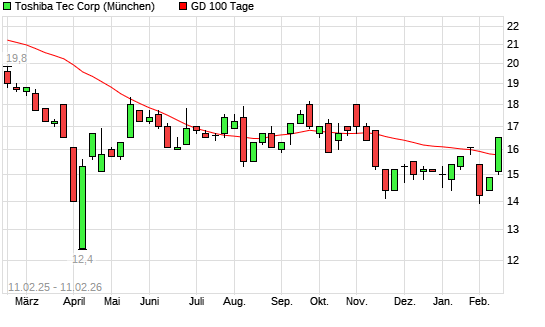 Mit dem Anstieg auf 15,90 EUR hat die Toshiba Tec-Aktie am 10.02.2026 die 100-Tage-Linie nach oben gekreuzt.Die Toshiba Tec-Aktie befindet sich seit dem 31.10.2025 im langfristigen Abwärtstrend ...weiterlesen