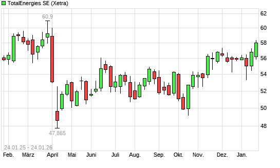 Mit dem Anstieg auf 58,26 EUR hat die Totalenergies (ex Total)-Aktie (ISIN FR0000120271) am 23.01.2026 ein neues 6-Monats-Hoch erreicht und damit den Kurs vom 21.01.2026 eingestellt.Die Totalenergies ...weiterlesen