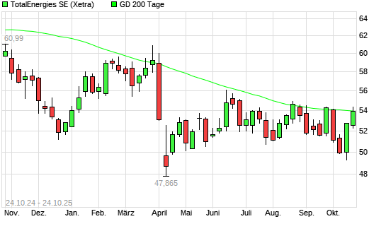 Mit dem Anstieg auf 53,93 EUR hat die Totalenergies (ex Total)-Aktie am 23.10.2025 die 200-Tage-Linie nach oben gekreuzt.Die Totalenergies (ex Total)-Aktie befand sich seit dem 25.08.2025 im ...weiterlesen