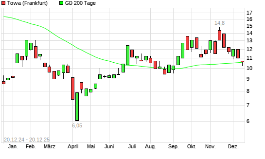 Mit dem Anstieg auf 10,60 EUR hat die Towa-Aktie am 19.12.2025 die 200-Tage-Linie nach oben gekreuzt.Die Towa-Aktie befand sich seit dem 16.12.2025 im langfristigen Abwärtstrend und hat in diesem ...weiterlesen
